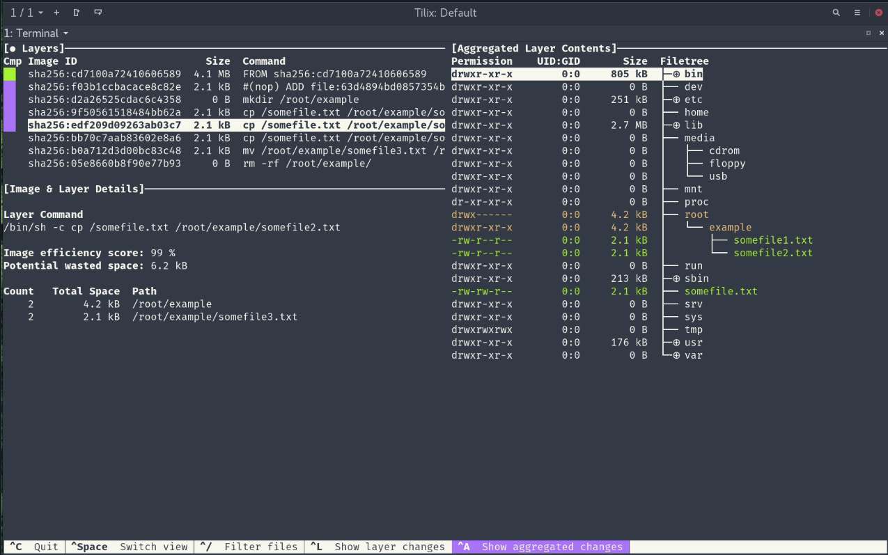 用來分析 Container Image 中每一層 Layer 的變化。可找出是否將不必要的檔案也 commit 到 Layer 中,或是尋找第三方 Container Image 文件上沒有說明的檔案目錄進行學習或除錯。