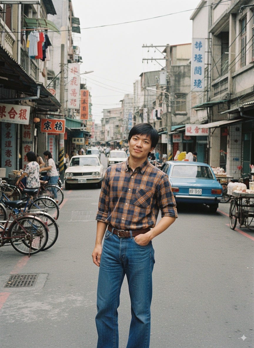 我也拿了數年前的大頭照來產生 1970 年代風格的圖片(下圖)。背景與脖子以下的身體都是 AI 幫我生成的(所以身材還不錯)。