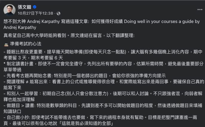 💡 如何獲得好成績 Doing well in your courses a guide by Andrej Karpathy (FB)